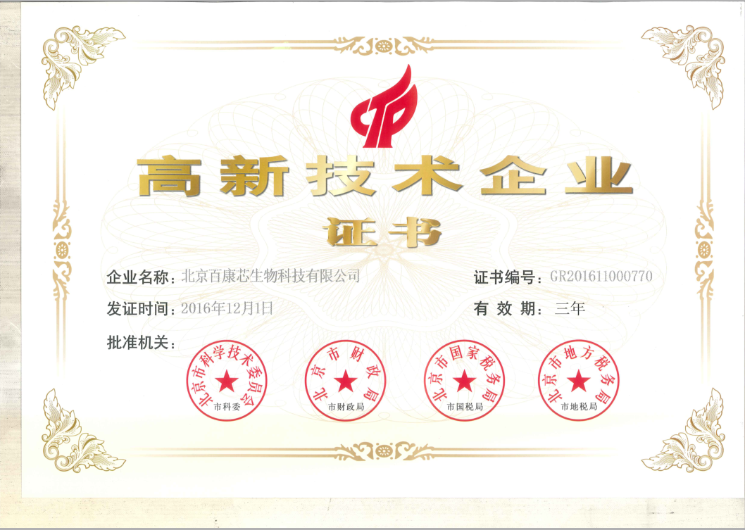 北京百康芯生物科技有限公司于2016年12月1日榮獲北京市科學技術(shù)委員會、北京市財政局、北京市國家稅務局、北京市地方稅務局聯(lián)合頒布的高新