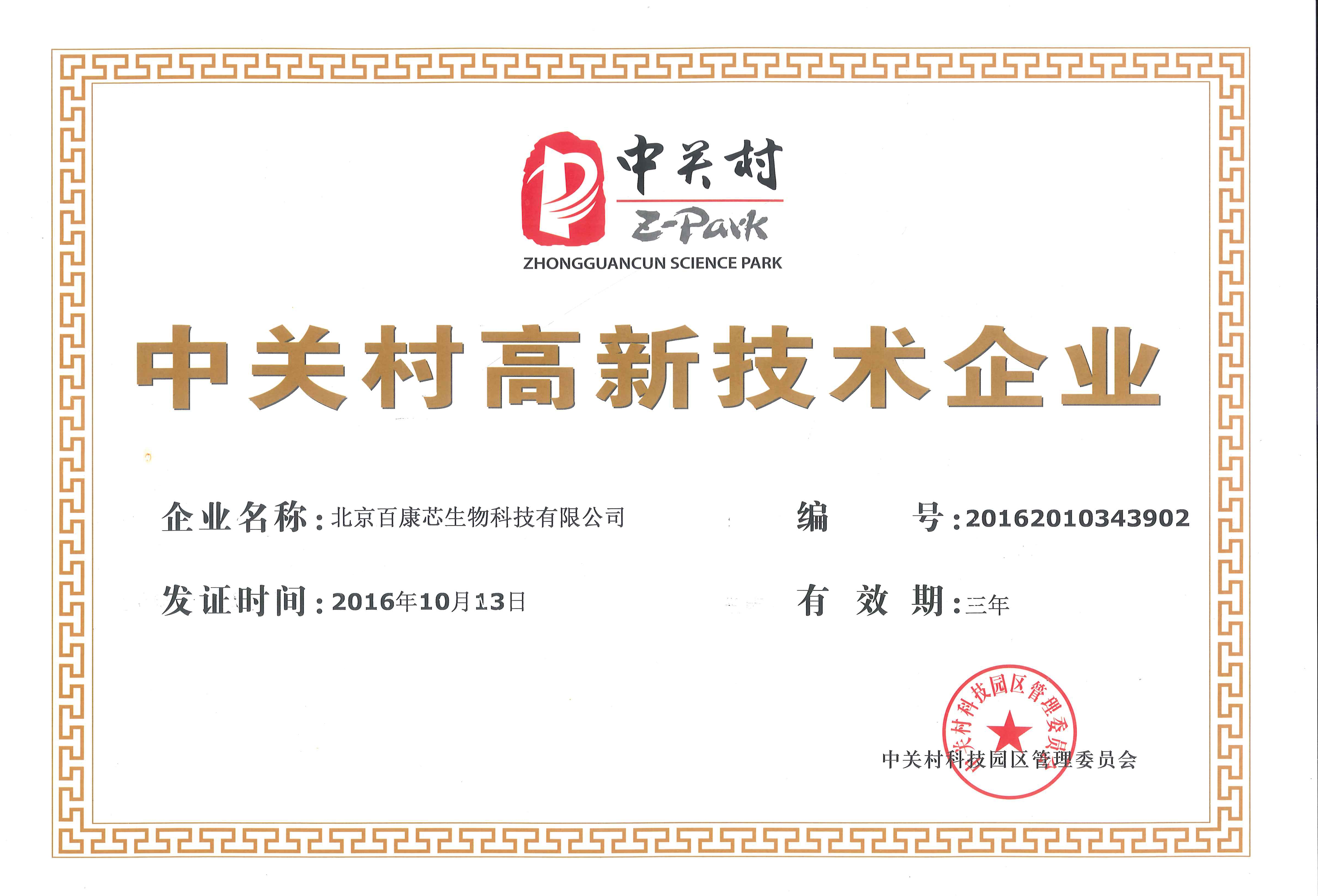 2016年10月14日,北京百康芯生物科技有限公司成功通過中關(guān)村高新技術(shù)企業(yè)認(rèn)定,正式榮獲由北京中關(guān)村科技園區(qū)管理委員會(huì)頒發(fā)的“中關(guān)村高新